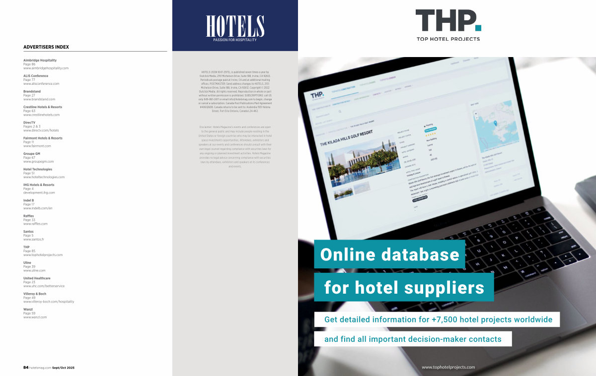 HOTELS( ISSN 1047-2975), is published seven times a year by Outclick Media, 2151 Michelson Drive, Suite 188, Irvine, CA 92612. Periodicals postage paid at Irvine, CA and at additional mailing offices. POSTMASTER: Send address changes to HOTELS, 2151 Michelson Drive, Suite 188, Irvine, CA 92612. Copyright © 2022 Outclick Media. All rights reserved. Reproduction in whole or part without written permission is prohibited. SUBSCRIPTIONS: call US only 949-861-2417 or email info @ hotelsmag. com to begin, change or cancel a subscription. Canada Post Publications Mail Agreement # 40612608. Canada returns to be sent to: Asdendia 1931 Helena Street, Fort Erie Ontario, Canada L2A 4K2.