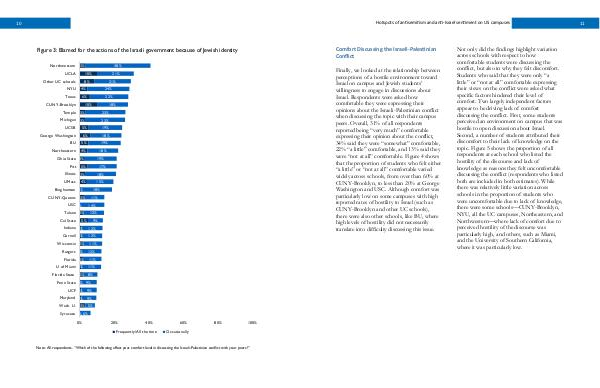 Not only did the findings highlight variation across schools with respect to how comfortable students were discussing the conflict, but also in why they felt discomfort. Students who said that they were only“ a little” or“ not at all” comfortable expressing their views on the conflict were asked what specific factors hindered their level of comfort. Two largely independent factors appear to be driving lack of comfort discussing the conflict. First, some students perceived an environment on campus that was hostile to open discussion about Israel. Second, a number of students attributed their discomfort to their lack of knowledge on the topic. Figure 5 shows the proportion of all respondents at each school who listed the hostility of the discourse and lack of knowledge as reasons they felt uncomfortable discussing the conflict( respondents who listed both are included in both estimates). While there was relatively little variation across schools in the proportion of students who were uncomfortable due to lack of knowledge, there were some schools— CUNY-Brooklyn, NYU, all the UC campuses, Northeastern, and Northwestern— where lack of comfort due to perceived hostility of the discourse was particularly high, and others, such as Miami, and the University of Southern California, where it was particularly low.