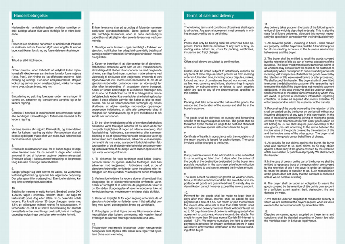 12. Disputes concerning goods supplied on these terms and conditions shall be decided according to Danish law with the municipal court in Skive as legal venue.
