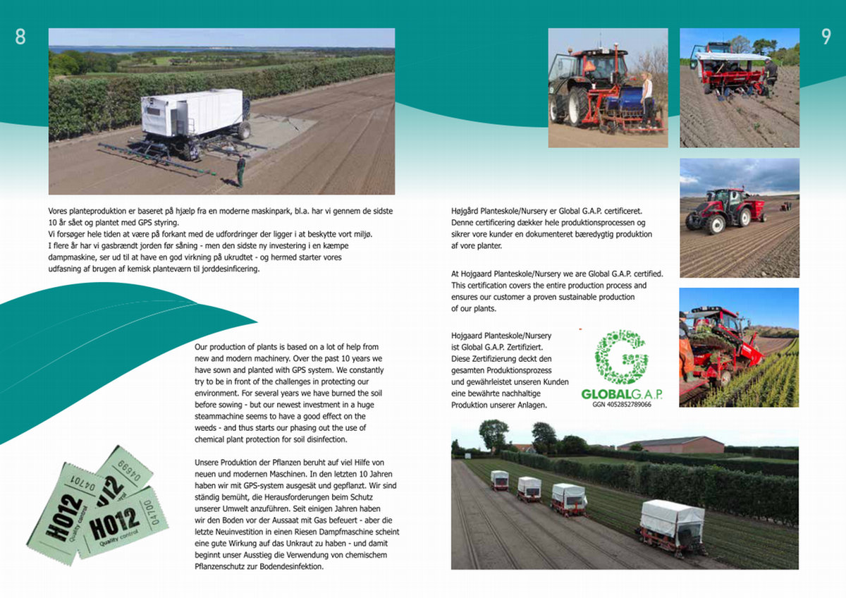 Our production of plants is based on a lot of help from new and modern machinery. Over the past 10 years we have sown and planted with GPS system. We constantly try to be in front of the challenges in protecting our environment. For several years we have burned the soil before sowing- but our newest investment in a huge steammachine seems to have a good effect on the weeds- and thus starts our phasing out the use of chemical plant protection for soil disinfection.