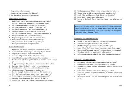 say about this? Death What would you say about this on your deathbed? Authority My trainer might tell you to… Return to Goalwork That’s very interesting – and what do you want? Appropriate provocation can accelerate clarification and help people laugh at their issues. It can aid insight and integration, and help people find integrity. Creating irritation or confusion can strengthen resistance. Marina Budimir, Croatia Meta-Model Challenges (from NLP) Universals All? Every? Never? Is there no other possibility? Beliefs According to whom? Who told you that? Mind Reading How you know what he/she/I thought? Cause-Effect I don’t understand. How can you make them happy? Necessities What would you do if you could change this situation? Time How long do you want to keep believing that? Definitions You interacted with her? What does interacted mean? Provocation to challenge beliefs 1. 2. 3. 4. 5. 6. Agreement: Provoke a person to mismatch their own belief Counter-examples: Find examples that do not fit a belief Redefine: Substitute a belief with similar meaning and different implications Consequence: Mention some effects of keeping a belief Intention: Find the purpose or intention of a belief (pleasant or unpleasant) Decompose: Break a complex belief into pieces and evaluate each piece 628