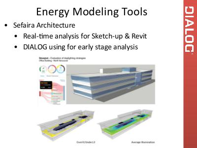 Energy Modeling Tools • Sefaira Architecture • Real-‐\me analysis for Sketch-‐up & Revit • DIALOG using for early stage analysis
