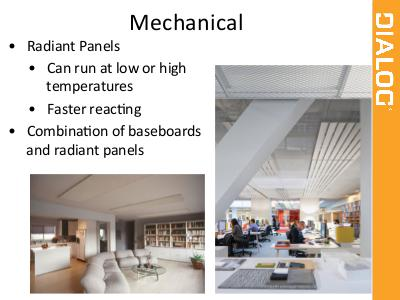 Mechanical • Radiant Panels • Can run at low or high temperatures • Faster reac\ng • Combina\on of baseboards and radiant panels