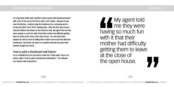 On a big blank white wall I painted a black square with blackboard paint with a bar of red across the top to add a color splash . Because it was near the kitchen , I started using the blackboard as a shopping and todo list and didn ’ t rub it off for viewing days . After the first open house I noticed children had drawn on the board as well . My agent told me they were having so much fun with it that their mother had difficulty getting them to leave at the close of the open house . I ’ m sure those kids helped me sell for more by telling their mother how much they liked the blackboard . Now they can draw on it anytime they like because their parents bought my house !