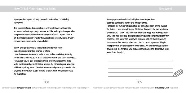 Average plus online visits should yield more inspections , potential competing buyers and multiple offers . I checked my number of visits after my home had been on the market for 3 days . I was averaging over 75 visits a day when the average in my area was 20 . I knew I had a winner and my strategy was working really well . This was essential if I wanted to have buyers competing to buy my property . One buyer has nobody to compete with so there is no rush to make an offer . On the other hand , two or more buyers resulting in multiple offers are the dream of every seller . An above average number of visits told me my price was okay and my images and descriptive copy were doing their job .