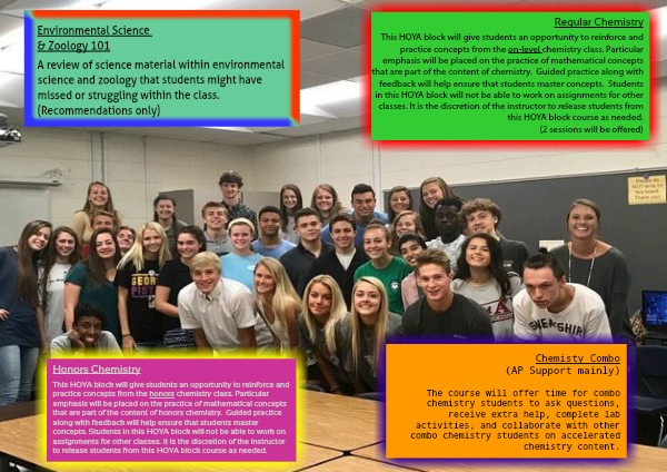 This HOYA block will give students an opportunity to reinforce and practice concepts from the honors chemistry class. Particular emphasis will be placed on the practice of mathematical concepts that are part of the content of honors chemistry. Guided practice along with feedback will help ensure that students master concepts. Students in this HOYA block will not be able to work on assignments for other classes. It is the discretion of the instructor to release students from this HOYA block course as needed.
