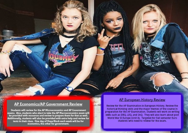 Students will review for the AP Microeconomics and AP Government exams. Also, students who elect to take the AP Macroeconomics exam will be provided with resources and review to prepare them for that as well. Additionally, students will also be provided with extra help and review for tests in their class. One day of Hoya Block each week will be for economics, the other for government.