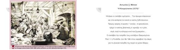 Αντωνίου Σ . Μάτεσι “ Η Κυπριώτισσα ( 1570 )” . . . . . . . . . . . . . . . . . . . . . . . . . . . . . . . . . Mπήκαν οι σκλάβοι αμέτρητοι … Tην άγκυρα σηκώνουν και στα κατάρτια τα πανιά οι ναύτες ξεδιπλώνουν . Πρίμος αγέρας τα φυσά , τ ’ ανοίγει , τα φουσκώνει , τρέχει ο πιλότος βιαστικός κι αρπάζει το τιμόνι , σιγά , σιγά το κάτεργο κινεί και ξεμακραίνει … Oι σκλάβοι την πατρίδα τους κοιτάζουν δακρυσμένοι . Πού ’ ν ’ η Pενάλδα ; Δεν θα ’ λθεί στου καραβιού την άκρη για τη γλυκειά πατρίδα της πικρό να χύσει δάκρυ ;