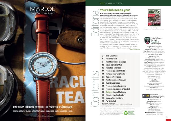 5 Vice Chairman 7 From the CEO 9 The Chairman ’ s message 12 News from the Club 16 The 2023 calendar 19 Feature : Classic FF1600 21 Historic Sporting Trials 24 Autosport 3 Hours 26 The Silverstone Festival 28 Twenty years ago 32 Feature : helmet painting 34 Feature : the return of the Daf 36 Gallery : Special Saloons 38 Tribute : Charles Barter 41 Marshalling matters 42 Parting shot