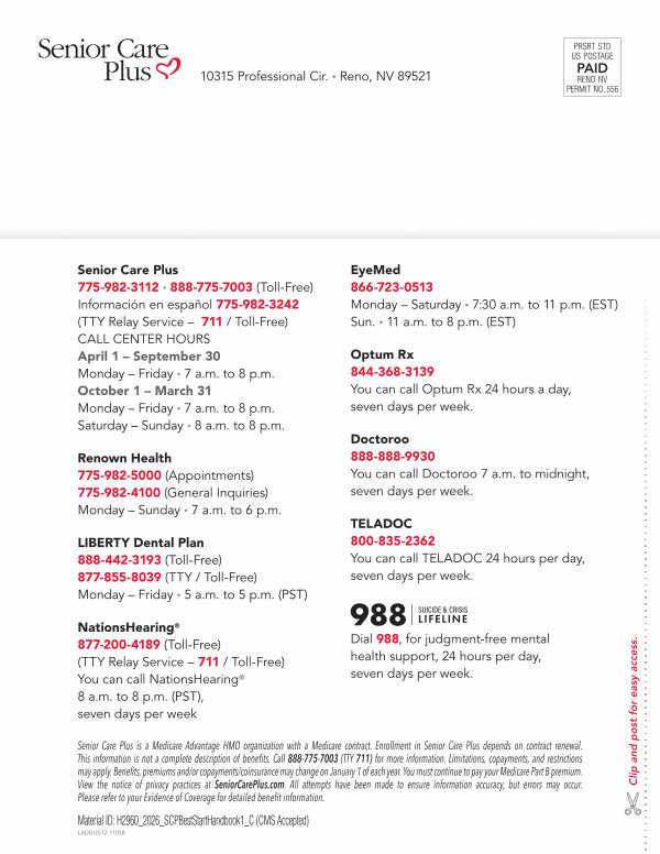 Senior Care Plus 775-982-3112 • 888-775-7003( Toll-Free) Información en español 775-982-3242( TTY Relay Service – 711 / Toll-Free) CALL CENTER HOURS April 1 – September 30 Monday – Friday • 7 a. m. to 8 p. m. October 1 – March 31 Monday – Friday • 7 a. m. to 8 p. m. Saturday – Sunday • 8 a. m. to 8 p. m.