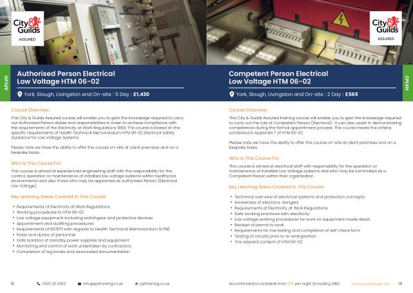 This City & Guilds Assured training course will enable you to gain the knowledge required to carry out the role of Competent Person ( Electrical ). It can also assist in demonstrating competence during the formal appointment process . The course meets the criteria contained in Appendix 7 of HTM 06-02 .