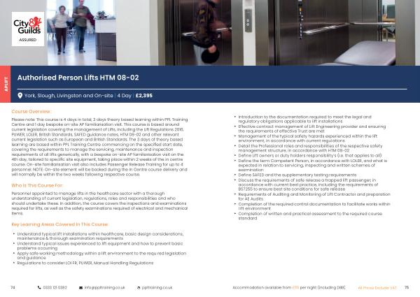 Please note : This course is 4 days in total , 3 days theory based learning within PPL Training Centre and 1 day bespoke on-site AP familiarisation visit . This course is based around current legislation covering the management of Lifts , including the Lift Regulations 2016 , PUWER , LOLER , British Standards , SAFED guidance notes , HTM 08-02 and other relevant current legislation such as European and British Standards . The 3 days of theory based learning are based within PPL Training Centre commencing on the specified start date , covering the requirements to manage the servicing , maintenance and inspection requirements of all lifts generically , with a bespoke on-site AP familiarisation visit on the 4th day , tailored to specific site equipment , taking place within 2 weeks of the in centre course . On-site familiarisation visit also includes Passenger Release Training for up to 4 personnel . NOTE : On-site element will be booked during the In Centre course delivery and will normally be within the two weeks following respective course .