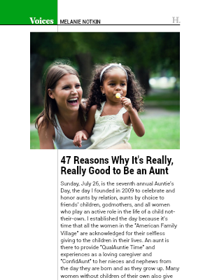 Sunday, July 26, is the seventh annual Auntie's Day, the day I founded in 2009 to celebrate and honor aunts by relation, aunts by choice to friends' children, godmothers, and all women who play an active role in the life of a child not-their-own. I established the day because it's time that all the women in the "American Family Village" are acknowledged for their selfless giving to the children in their lives. An aunt is there to provide "QualAuntie Time" and experiences as a loving caregiver and "ConfidAunt" to her nieces and nephews from the day they are born and as they grow up. Many women without children of their own also give tirelessly to children all over the world. These "BenevolAunts" are due their day to be honored.