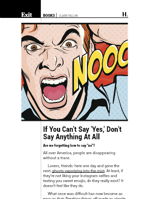 We seem to have become a nation of wafflers and avoiders, carefully evading even the most quotidian confrontation. It's not just in the realm of dating, either. "I see this in college classrooms all the time," linguist Naomi Baron told me, "that people are less willing to take positions on anything." Nothing stakes out a position more firmly, and more provocatively, than "no," and increasingly, it's far easier to simply not say it.