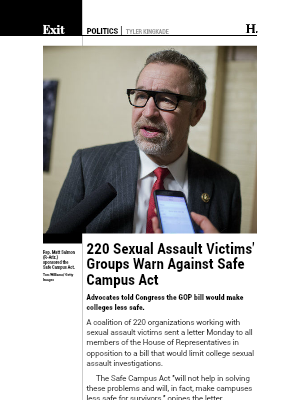 The bill, sponsored by Rep. Matt Salmon (R-Ariz.), would restrict colleges from investigating sexual assault cases unless police are involved. It would allow schools to use higher standards of proof in determining guilt, making it more difficult to remove a student accused of sexual violence on campus. No other student misconduct would be held to the same standards.