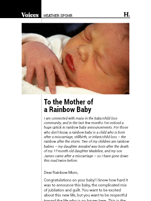 I am connected with many in the baby/child loss community, and in the last few months I've noticed a huge uptick in rainbow baby announcements. For those who don't know, a rainbow baby is a child who is born after a miscarriage, stillbirth, or infant/child loss – the rainbow after the storm. Two of my children are rainbow babies – my daughter Annabel was born after the death of my 17-month old daughter Madeline, and my son James came after a miscarriage – so I have gone down this road twice before.