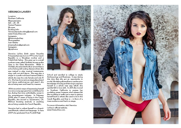 School and enrolled in college to study Anthropology and Business. It was during this time that she got an opportunity to model. Modeling allowed her to use her prior knowledge of acting and dancing to express herself in a whole new way which she quickly fell in love with. In 2011 she moved to Southern California to pursue her modeling career, however, she’s always felt like modeling is really just a start in getting herself back to where she used to be in the Czech Republic, and that is – in front of a mass audience and back on stage.