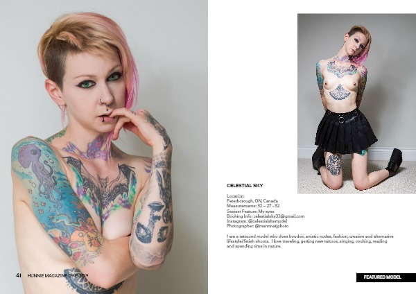 I am a tattooed model who does boudoir, artistic nudes, fashion, creative and alternative lifestyle/fetish shoots. I love traveling, getting new tattoos, singing, cooking, reading and spending time in nature.