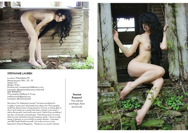 Hey there. I’m Stephanie Lauren! I’ve been modeling for roughly 6 years and I absolutely love what I do! Photography itself has always been a huge passion of mine, so being able to shoot and create as a career has been a dream come true! I adore the people I work with very much. Aside from modeling, I am also a licensed cosmetologist. That being said, I do arrive with my own wardrobe, hair and makeup ready. I shoot a wide range of genres, so my portfolio is pretty diverse. I manage/own Elk Creek Studios as well. It is truly an honor to be featured in Hunnie Magazine. Thank you so much! Cheers!