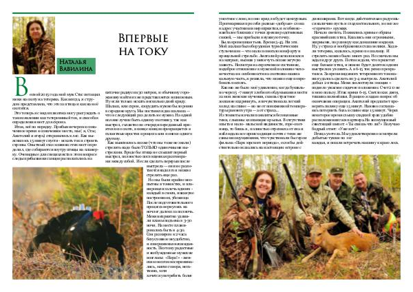 уместное слово, но оно вряд ли будет цензурным. Проговаривая про себя разные « добрые » слова в адрес участников мероприятия, и особенно- наиболее близких с точки зрения родственных связей,— мы прибыли в нужную точку. Была кромешная тьма. Время 5-45. Ни зги. Мой шалаш был оборудован туристическим стульчиком— что мало помогало комфорту и прицельной стрельбе. Анатолий расположился на матрасе, вызвав у меня чуть позже жгучую зависть. Несмотря на скрюченное состояние, недоброе отношение к мужской половине человечества и в особенности на охотнико-маниакальную часть, я решила, что можно еще попробовать поспать. Каково же было моё удивление, когда буквально через 5-7 минут злобного обдумывания мести за мои женские мучения, сквозь страстное желание вздремнуть, я почувствовала легкий холод на спине— но не от пониженной температуры раннего утра— а от страха... Из темноты начали появляться безмолвные тени, слышны хлопающие крылья. В отсутствии опыта и мало- мальской видимости, горе-охотница, то бишь я, полностью отрезвела от сна и наблюдала все происходящее почти с теми же самыми ощущениями, что чувствовали бы герои фильма « Парк юрского периода », если бы действительно оказались на настоящем острове с динозаврами. Вот когда действительно радуешься наличию пусть и гладкоствольного, но все же « горячего » оружия. Начало светать. Появились зримые образы красивейших птиц. Казались они огромными, жирными, по размеру как домашние индюки. Ну, у страха и воображения глаза велики. Ходили тетерева, казалось, прямо по шалашу. И стрелять можно было много раз. Но сначала мы ждали друг друга. Потом ждали, что прилетит еще больше птиц, и можно будет десяток одним выстрелом уложить. А в 6-15 ток резко прекратился. За время видимого тетеревиного токования удалось сделать по 3-4 выстрела. Анатолий добыл 2 птицы. Меня захлестнули эмоции + подвело ужасное сидячее положение. Счет 2:0 не в мою пользу. Итак время 6-15. Светло как днем, тишина полнейшая. В рацию я задаю вопрос об окончании операции. Анатолий предлагает проверить поляну еще 15 минут. Наивно соглашаюсь потерпеть боль в спине еще 15 минут. Через некоторое время слышу сладкий храп удобно расположившегося партнера. На возмущенный свистящий шепот: « Ты спишь что ли?» Получаю бодрый ответ: « Уже нет!» Птица улетела. Мы удовлетворенно осмотрели добытые тушки по 1 кг каждая, и пошли встречать машину к краю леса.
