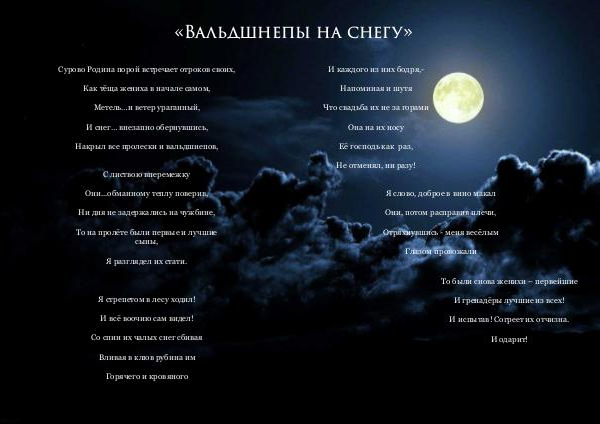 Сурово Родина порой встречает отроков своих, Как тёща жениха в начале самом, Метель … и ветер ураганный, И снег … внезапно обернувшись, Накрыл все пролески и вальдшнепов,
