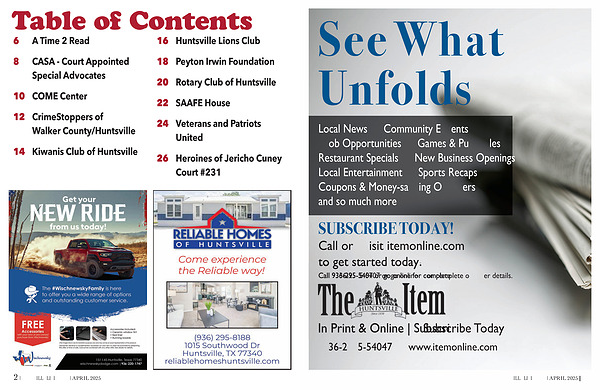 16 Huntsville Lions Club 18 Peyton Irwin Foundation 20 Rotary Club of Huntsville 22 SAAFE House