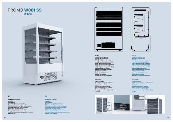 Pés niveladores Controlador eletrónico de temperatura Descongelação automática e programável Evaporação automática das águas de descongelação Sistema anti vibratório do grupo compressor Pára-produtos em aço inoxidável Laterais solid injetados com interior SK Iluminação superior LED 4 Níveis de prateleiras amovíveis, ajustáveis e inclináveis Exterior em SK Persiana elétrica com comando de chave