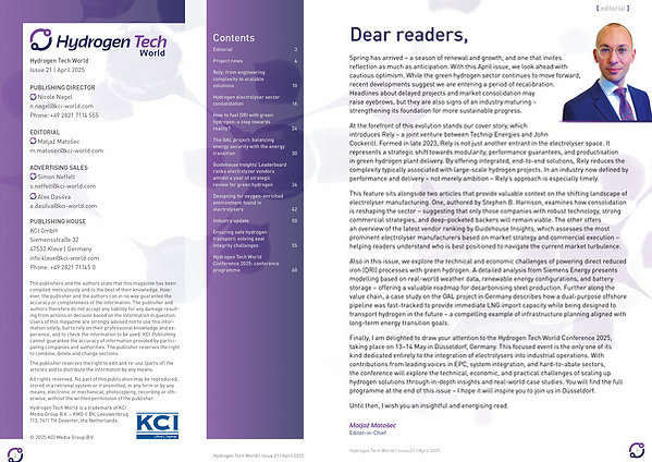 Spring has arrived – a season of renewal and growth, and one that invites reflection as much as anticipation. With this April issue, we look ahead with cautious optimism. While the green hydrogen sector continues to move forward, recent developments suggest we are entering a period of recalibration. Headlines about delayed projects and market consolidation may raise eyebrows, but they are also signs of an industry maturing – strengthening its foundation for more sustainable progress.