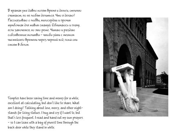 В храмах уже давно копят время и деньги , отлично считают , но не любят делиться . Что я делаю ? Рассказываю о любви , милосердии и прочих тумбочках для живых статуй . Обнимаюсь и плачу , если захочется , но это реже . Читаю и раздаю собственные молитвы - чтобы уйти с мешком чистейшего времени через черный ход , пока они стоят в белом .