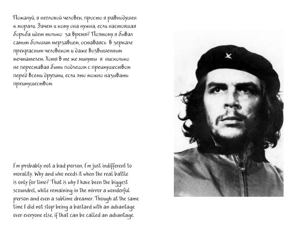 I ’ m probably not a bad person , I ’ m just indifferent to morality . Why and who needs it when the real battle is only for time ? That is why I have been the biggest scoundrel , while remaining in the mirror a wonderful person and even a sublime dreamer . Though at the same time I did not stop being a bastard with an advantage over everyone else , if that can be called an advantage .