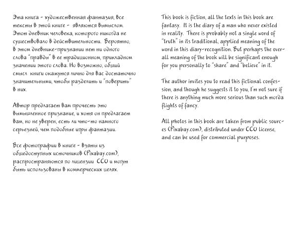 This book is fiction , all the texts in this book are fantasy . It is the diary of a man who never existed in reality . There is probably not a single word of “ truth ” in its traditional , applied meaning of the word in this diary-recognition . But perhaps the overall meaning of the book will be significant enough for you personally to “ share ” and “ believe ” in it .