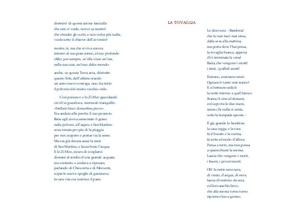 Così pensavo: e lo Zi Meo guardando ciò ch’ io guardava, mormorò tranquillo: « Stellato fisso: domattina piove ». Era andato alle porche il suo pensiero. Bene egli aveva sementato il grano nella polvere, all’ aspro; e San Martino avea tenuta per più dì la pioggia per non scoprire e portar via la seme. Ma era già durata assai la state di San Martino, e facea bono l’ acqua. E lo Zi Meo, sicuro di svegliarsi domani al rombo d’ una grande acquata, era contento, e andava a riposare, parlando di Chioccetta e di Mercanti, sopra le nuove spoglie di granturco, la cara vita cui nutrisce il pane.