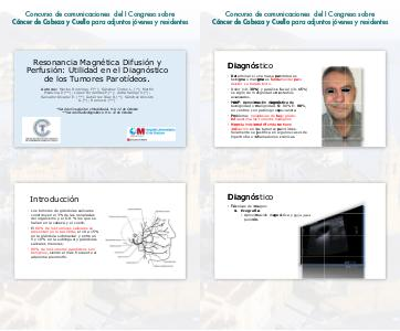 Concurso de comunicaciones del I Congreso sobre Cáncer de Cabeza y Cuello para adjuntos jóvenes y residentes Diagnóstico • Dete ni be Diagnóstico u Determinar si gna o maligna ni Diagnóstico na masa par es gna fundam parotidea es para ental fundam deci • Dol es si avanzado • AAF P gna gna cidir su tratami( 10 or-30 %) y pa mal signo de anzados.: Aproxima AAF gna ento mi. 30 %) y parálisis faci lignidad en e ción diagnósti ma pa( 10 al faci-15 %) n estadios ca de agnósti 15 %) PAAF benig en • Probl Infr • opsi Bi AAF: Aproxima nignidad o ma centros con ema: Probl pl neo Infraestima los opsia incisional mación diagnósti malignidad. S: espe patólogo baj plasias de tumores mal diferida no onal agnóstica de 98 %, S: 80 % E: specialista. o grado baj. alignos no tiene 98 %, • opsi Bi indi Sol hip opsia incisional cación ndi os tumo en l justi amente se rtrofia o inf e diferida no onal os tumores par justifica en al lamaciones cró nf no tiene parotídeos. gunos casos nicas. cró de Diagnóstico � Técni 1. Diagnóstico ima Técnicas de 1. ía f Ecogra Diagnóstico magen: ía: � ma Aproxi ción. pun mación diagnósti ón. ca agnósti y g