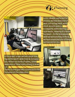 In this valuable , useful and full process , we have done a lot of work such as logo work , word cloud , acrostic poetry , e-magazine , online meetings , team works , meaning of to be an European ... As the time passes while we were working on those , we have researched a lot of things and learned lots too .