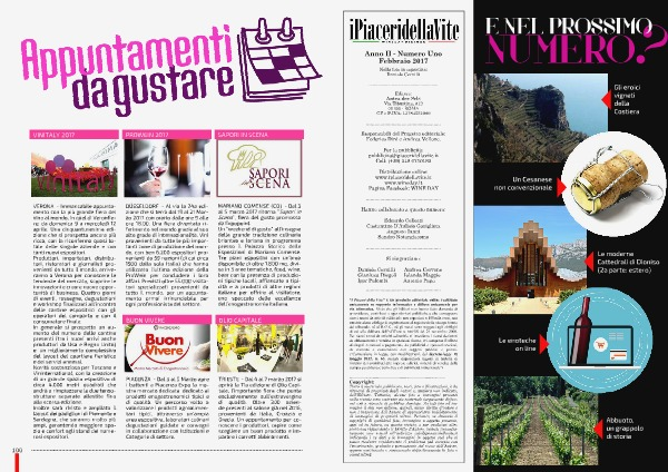 ..................................................................................... Copyright: Tutto il materiale pubblicato, testi, foto e illustrazioni, è da ritenersi di proprietà degli Autori e, qualora non indicato, dell ' Editore. Tuttavia, alcune foto o immagini presenti nella rivista sono costruite da materiale largamente diffuso nel web e ritenuto di pubblico dominio. Su tali foto ed immagini il sito non detiene, quindi, alcun diritto d ' autore e non è intenzione dell ' Autore di appropriarsi indebitamente di immagini di proprietà altrui. Pertanto, se detenete il copyright di qualsiasi foto, immagine o oggetto presente, oggi ed in futuro, su questa rivista, o per qualsiasi altro problema riguardante il Diritto d ' Autore, inviate immediatamente una e-mail all ' indirizzo info @ ipiaceridellavite. it indicando i vs dati e le immagini in oggetto così che si possa risolvere rapidamente il problema( ad esempio con l ' inserimento, gratuito e permanente del nome dell ' Autore, oppure sostituendo o rimuovendo definitivamente la foto o quant ' altro).
