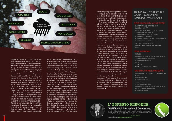 mento degli impianti frigoriferi, rottura di bottiglie, tappo saltato, ecc), per atti vandalici o dolosi( piante tagliate o incendiate) e per molti altri casi ancora. E ' sottointenso che ogni imprenditore avrà sempre la libertà di“ incollarsi” tali rischi sulle proprie spalle. Una decisione discutibile, ma del tutto legittima, che nel breve periodo si tradurrebbe in un risparmio economico per l’ azienda, che non dovrà impegnarsi a corrispondere( anticipatamente) un premio assicurativo. E’ però altrettanto vero che nel lungo periodo questo tipo di scelta potrebbe rivelarsi anche molto, molto pericolosa, andando a mettere a repentaglio la stessa sopravvivenza dell’ azienda. Ecco perché, specialmente per un’ azienda agricola, che per caratteristiche proprie risulta essere maggiormente vulnerabile ed esposta al rischio naturale( e non solo), sarebbe sempre opportuno mettere a budget la stipula di una polizza, a copertura sia delle attrezzature che della stessa produzione. Del resto, non stiamo parlando di una spesa“ strictu sensu”, ma di un investimento economico adeguatamente controbilanciato dalla certezza della tutela del proprio patrimonio nel( malaugurato) caso si verificasse un " sinistro ". Argomenti forse scontati e assodati per l’ imprenditore previdente, ma che comunque vale la pena di suggerire a chi ha iniziato a cimentarsi da poco tempo nell ' affascinante mestiere di vignaiolo. ■