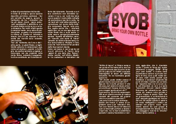 in fase di prenotazione del tavolo. In linea di principio, quello appena descritto potrebbe sembrare l’ iter più corretto da seguire, eppure in tantissimi, sia tra i ristoratori che tra gli stessi clienti, hanno esternato perplessità o addirittura una chiusura totale anche verso una tale dinamica. Per molti infatti questa è semplicemente una pratica di cattivo gusto, un gesto che innanzitutto manca di rispetto al ristoratore stesso, che è lì per lavorare e vive anche dei ricarichi sulle bevande, vino incluso. Tesi più moderate, dall’ una e dall’- altra parte, ne giustificano la legittimità soltanto in determinati casi, come ad esempio quando la bottiglia sia particolarmente pregiata o comunque non sia presente nella carta, fermo restando il pagamento di un contributo per il servizio offerto dal ristorante. Secondo alcuni tale contributo non dovrebbe superare i 5 euro, per molti dovrebbe valere quanto il costo della bottiglia più economica presente in carta, ma per tanti altri andrebbe calcolato in percentuale sul valore delle bottiglie consumate. Eppure nella pratica capita anche che i ristoranti applichino poi un sovrapprezzo sul conto finale che a volte anche risulta essere sproporzionatamente elevato rispetto all’ effettivo servizio ricevuto: una sorta di“ tassa” pensata per disincentivare tale pratica senza tuttavia rifiutarla in toto, cosa che rischierebbe di far perdere definitivamente il cliente. Come premesso, è ben lungi da noi volerci schierare in favore delle ragioni di una delle due“ fazioni”. Anche perché, nell’ infinito dibattito tra sostenitori e detrattori del