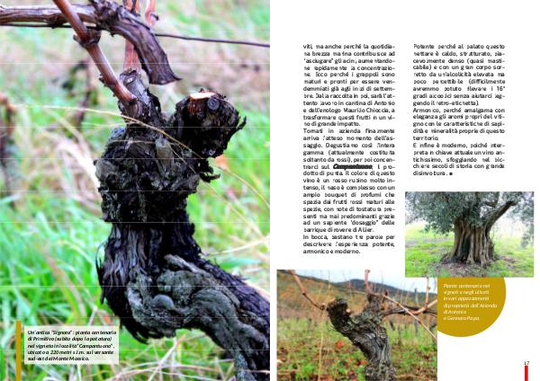 viti, ma anche perché la quotidiana brezza marina contribuisce ad“ asciugare” gli acini, aumentandone rapidamente la concentrazione. Ecco perché i grappoli sono maturi e pronti per essere vendemmiati già agli inizi di settembre. Dalla raccolta in poi, sarà l’ attento lavoro in cantina di Antonio e dell’ enologo Maurilio Chioccia, a trasformare questi frutti in un vino di grande impatto. Tornati in azienda finalmente arriva l’ atteso momento dell’ assaggio. Degustiamo così l’ intera gamma( attualmente costituita soltanto da rossi), per poi concentrarci sul Campantuono, il prodotto di punta. Il colore di questo vino è un rosso rubino molto intenso, il naso è complesso con un ampio bouquet di profumi che spazia dai frutti rossi maturi alle spezie, con note di tostatura presenti ma mai predominanti grazie ad un sapiente“ dosaggio” delle barrique di rovere di Allier. In bocca, bastano tre parole per descrivere l’ esperienza: potente, armonico e moderno.