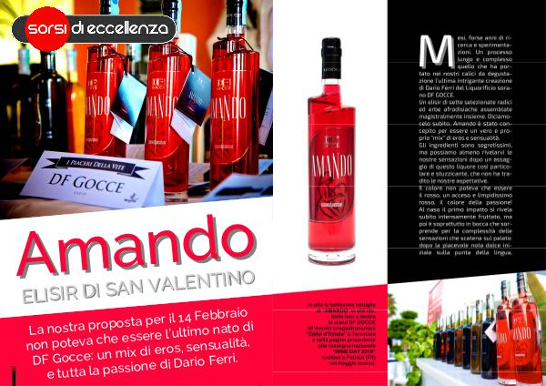 esi, forse anni di ricerca e sperimentazioni. Un processo lungo e complesso quello che ha portato nei nostri calici da degustazione l’ ultima intrigante creazione di Dario Ferri del Liquorificio sorano DF GOCCE. Un elisir di sette selezionate radici ed erbe afrodisiache assemblate magistralmente insieme. Diciamocelo subito. Amando è stato concepito per essere un vero e proprio " mix " di eros e sensualità. Gli ingredienti sono segretissimi, ma possiamo almeno rivelarvi le nostre sensazioni dopo un assaggio di questo liquore così particolare e stuzzicante, che non ha tradito le nostre aspettative. Il colore non poteva che essere il rosso, un acceso e limpidissimo rosso, il colore della passione! Al naso il primo impatto si rivela subito intensamente fruttato, ma poi è soprattutto in bocca che sorprende per la complessità delle sensazioni che scatena sul palato: dopo la piacevole nota dolce iniziale sulla punta della lingua, bbbbgua, improvvisamente una