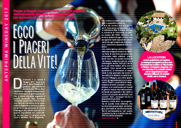 omenica 7 e lunedì 8 Maggio 2017. Sono queste le date fissate per il gustoso appuntamento annuale con“ Wine Day”, l’ esclusiva rassegna enogastronomica dalla quale è germogliata anche la rivista che state leggendo in questo momento. Una kermesse nazionale ideata nel 2009 da Federico Dini con l’ obiettivo di far conoscere e degustare vini buoni, attraverso un lungo percorso di banchi d ' assaggio di prodotti ricercati e di qualità. Soprattutto vini, come detto, ma non solo. Ci saranno anche liquori, distillati, birre artigianali,