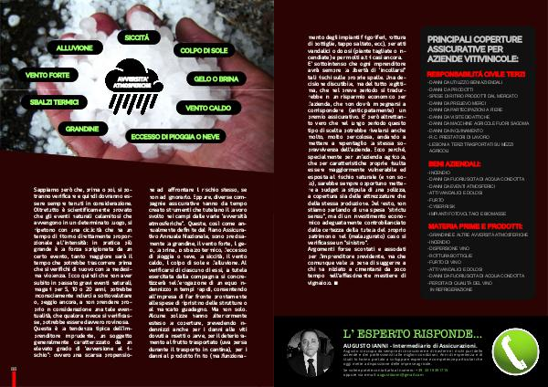 mento degli impianti frigoriferi, rottura di bottiglie, tappo saltato, ecc), per atti vandalici o dolosi( piante tagliate o incendiate) e per molti altri casi ancora. E ' sottointenso che ogni imprenditore avrà sempre la libertà di“ incollarsi” tali rischi sulle proprie spalle. Una decisione discutibile, ma del tutto legittima, che nel breve periodo si tradurrebbe in un risparmio economico per l’ azienda, che non dovrà impegnarsi a corrispondere( anticipatamente) un premio assicurativo. E’ però altrettanto vero che nel lungo periodo questo tipo di scelta potrebbe rivelarsi anche molto, molto pericolosa, andando a mettere a repentaglio la stessa sopravvivenza dell’ azienda. Ecco perché, specialmente per un’ azienda agricola, che per caratteristiche proprie risulta essere maggiormente vulnerabile ed esposta al rischio naturale( e non solo), sarebbe sempre opportuno mettere a budget la stipula di una polizza, a copertura sia delle attrezzature che della stessa produzione. Del resto, non stiamo parlando di una spesa“ strictu sensu”, ma di un investimento economico adeguatamente controbilanciato dalla certezza della tutela del proprio patrimonio nel( malaugurato) caso si verificasse un " sinistro ". Argomenti forse scontati e assodati per l’ imprenditore previdente, ma che comunque vale la pena di suggerire a chi ha iniziato a cimentarsi da poco tempo nell ' affascinante mestiere di vignaiolo. ■