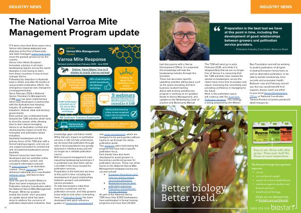 - Pollination Industry Coordinator Rebecca Sloan had discussions with a Varroa Development Officer. It is expected this knowledge will help the beekeeping industry through this transition. There has also been specific upskilling activities taking place such as the queen breeding and farm business resilient training. Along with training activities the program is working on an updated Guide to Varroa Management, and updates to the Beekeeping Code of practice and Biosecurity Manual.