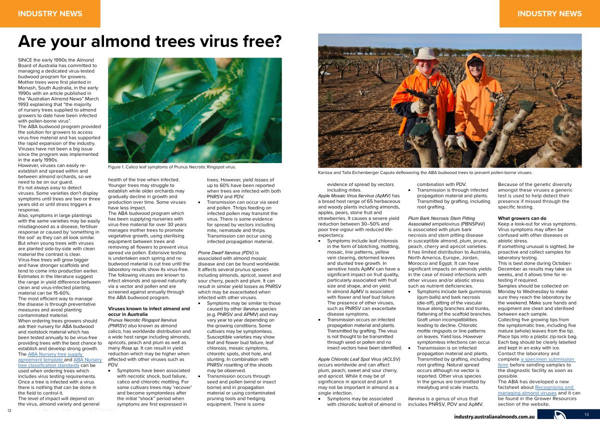 SINCE the early 1990s the Almond Board of Australia has committed to managing a dedicated virus-tested budwood program for growers. Mother trees were first planted in Monash, South Australia, in the early 1990s with an article published in the“ Australian Almond News” March 1993 explaining that“ the majority of nursery trees supplied to almond growers to date have been infected with pollen-borne virus”. The ABA budwood program provided the solution for growers to access virus-free material and has supported the rapid expansion of the industry. Viruses have not been a big issue since the program was implemented in the early 1990s. However, viruses can easily reestablish and spread within and between almond orchards, so we need to be on our guard. health of the tree when infected.