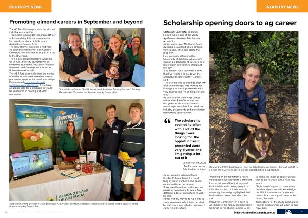 CONGRATULATIONS to James Haslett who is one of the 2025 AgriFutures Horizon Scholarship recipients. James grew up at Murtho in South Australia’ s Riverland on an almond, wine grape, citrus and stone fruit property. He’ s currently attending the University of Adelaide where he’ s studying a Bachelor of Science and majoring in soil science and plant biology.“ I’ ve known for a little while now that I’ ve wanted to go down the agricultural career path,” James said.“ The scholarship seemed to align with a lot of the things I was looking for, the opportunities it presented were very diverse and I’ m getting a lot out of it.” As part of the scholarship James will receive $ 10,000 for the last two years of his studies, attend workshops, complete four weeks of industry placements and benefit from networking opportunities.