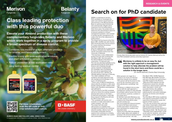 While growers are eager for a solution to be found, Dr Ashnest urged the industry to be patient.“ One person will be focussed on this issue for the next three years and they will discover something,” she said.“ Monterey is unlikely to be an easy fix, but with the right approach a management solution to help alleviate the problem will be found in the short term and there could be a solution in the longer term.” Dr Ashnest said while Monterey was the main variety of concern, the work is likely to be of benefit for other almond varieties too. She encouraged the almond industry to look to the future and ensure another generation of researchers were developed to continue very important work.“ At the end of the PhD, the graduate will be highly skilled and capable of working in the almond industry beyond this three-year period,” she said.