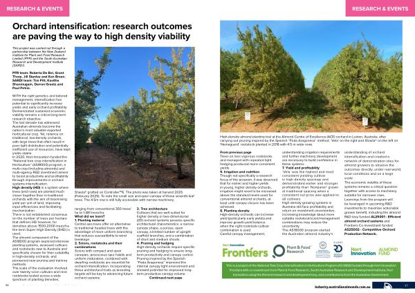 From previous page Trees on less vigorous rootstocks and managed with repeated light hedging produced more consistent yields. 5. Irrigation and nutrition Though not specifically a research focus of the program, it was observed that for earlier and higher yields in young, higher density orchards, irrigation might need to be increased above the standard levels used for conventional almond orchards, at least until canopy closure has been achieved. 6. Planting density High-density orchards can increase yield( particularly early yields) and improve growth-yield balance when the right rootstock-cultivar combination is used. Careful canopy management, understanding irrigation requirements and further machinery development are necessary to build confidence in these systems. 7. Yield and profitability‘ Vela’ was the highest and most consistent yielding cultivar in high density spacings and demonstrated earlier and stronger profitability than‘ Nonpareil’ grown at traditional spacing when a consistent nut price was applied to all cultivars. High density growing systems in Australia still face profitability and return on investment uncertainties; increasing knowledge about more suitable rootstock / scion / management combinations may reduce the uncertainty. The AS18000 program started the Australian almond industry’ s understanding of orchard intensification and created a network of demonstration sites for almond growers to observe the outcomes directly, under real-world, local conditions and on a large scale. The economic viability of these systems remains a critical question together with access to machinery suitable for narrower rows. Learnings from the program will be leveraged in upcoming R & D investments to maximise actionable grower benefit, including the almond R & D levy funded AL25001- Efficient almond orchard systems and Frontiers Co-investment funded AS25002- Competitive Orchard Production Network.