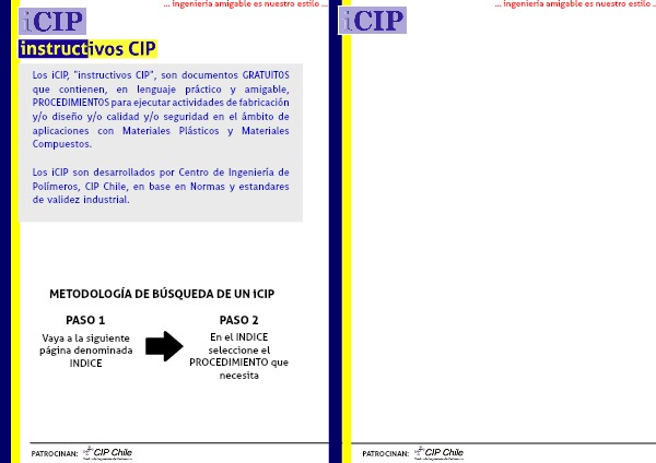 Los iCIP, "instructivos CIP", son documentos GRATUÍTOS que contienen, en lenguaje práctico y amigable, PROCEDIMIENTOS para ejecutar actividades de fabricación y/o diseño y/o calidad y/o seguridad en el ámbito de aplicaciones con Materiales Plásticos y Materiales Compuestos.