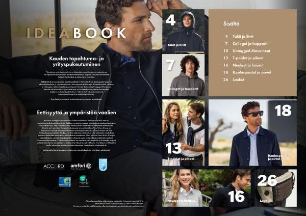 IDEABOOK-kuvastostamme löydät tyylikkäät J. Harvest & Frost-kauluspaidat ja puvut edustustilaisuuksiin ja yritystapahtumiin. Rennompaan tyyliin sopii Printer Essentials-mallisto, ja ekologisia vaihtoehtoja tarjoavat James Harvest, Cottover ja Untagged Movement. Tensonin ulkoiluvaatteet tuovat energiaa ja luonteenlujuutta yrityspukeutumiseen. Lisäksi kuvastosta löydät tarkoin valitut laukut, jotka viimeistelevät ilmeen tapahtumissa ja asiakastapaamisissa.