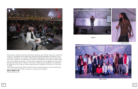 la música y ávidamente leyó las traducciones. Durante el periodo de preguntas y respuestas se trataron asuntos de gobierno, raza y pobreza. Mi hija siguió preguntándonos sobre Cuba, el sistema de salud, la raza y la pobreza, las condiciones de vivienda y las experiencias de su padre allá. Quería saber