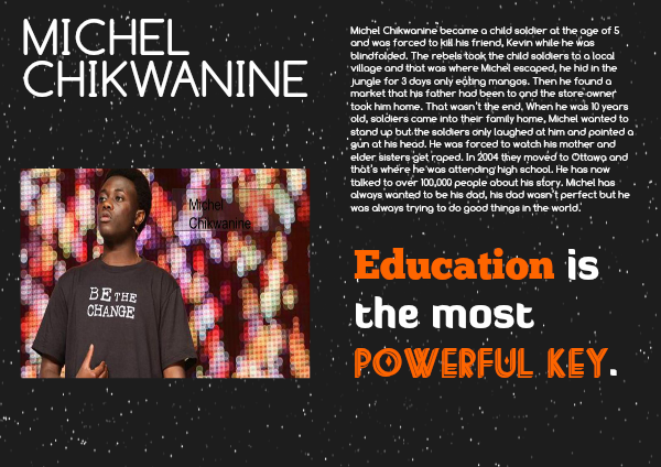 Michel Chikwanine became a child soldier at the age of 5 and was forced to kill his friend, Kevin while he was blindfolded. The rebels took the child soldiers to a local village and that was where Michel escaped, he hid in the jungle for 3 days only eating mangos. Then he found a market that his father had been to and the store owner took him home. That wasn’t the end. When he was 10 years old, soldiers came into their family home, Michel wanted to stand up but the soldiers only laughed at him and pointed a gun at his head. He was forced to watch his mother and elder sisters get raped. In 2004 they moved to Ottawa and that’s where he was attending high school. He has now talked to over 100,000 people about his story. Michel has always wanted to be his dad, his dad wasn’t perfect but he was always trying to do good things in the world.
